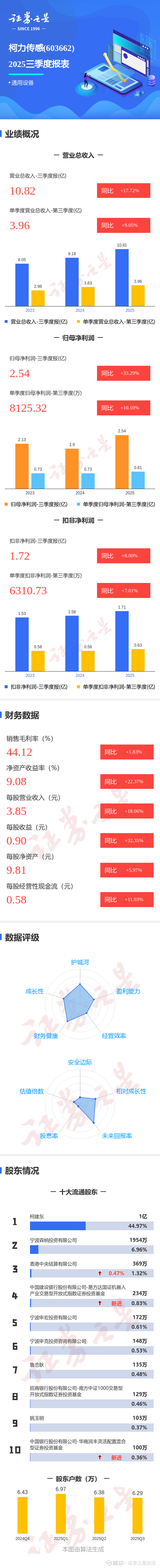 证券之星消息,柯力传感2025年三季报显示,前三季度公司主营收入10.82亿元,同比上升17.72%;归母净利润2.54亿元,同比上升33.29%;扣非净利润1.72亿元,同比上升8.0%;其中2025年第三季度,公司单季度主营收入3.96亿元,同比上升9.06%;单季度归母净利润8125.32万元,同比上升10.11%;单季度扣非净利润6310.73万元,同比上升7.02%;负债率30.16%,投资收益8798.9万元,财务费用799.37万元,毛利率44.12%。