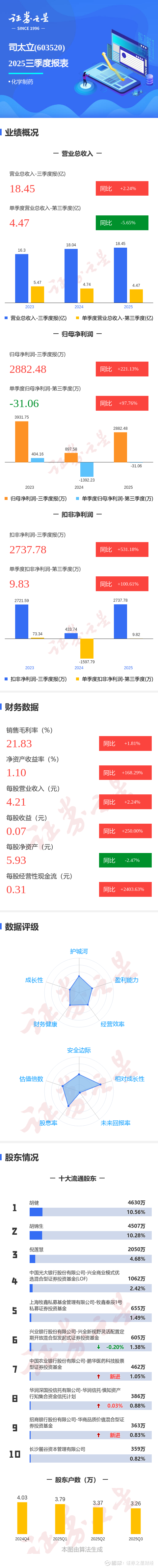 证券之星消息,司太立2025年三季报显示,前三季度公司主营收入18.45亿元,同比上升2.24%;归母净利润2882.48万元,同比上升221.14%;扣非净利润2737.78万元,同比上升531.19%;其中2025年第三季度,公司单季度主营收入4.47亿元,同比下降5.66%;单季度归母净利润-31.06万元,同比上升97.77%;单季度扣非净利润9.83万元,同比上升100.62%;负债率55.44%,投资收益-488.75万元,财务费用4613.13万元,毛利率21.83%。