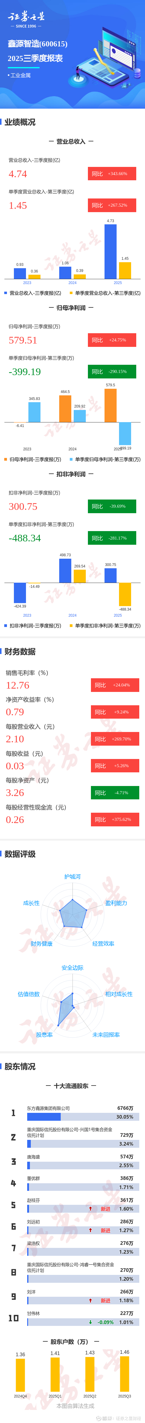 证券之星消息,鑫源智造2025年三季报显示,前三季度公司主营收入4.74亿元,同比上升343.67%;归母净利润579.51万元,同比上升24.76%;扣非净利润300.75万元,同比下降39.7%;其中2025年第三季度,公司单季度主营收入1.45亿元,同比上升267.52%;单季度归母净利润-399.19万元,同比下降290.16%;单季度扣非净利润-488.34万元,同比下降281.18%;负债率33.35%,投资收益970.84万元,财务费用-121.0万元,毛利率12.76%。