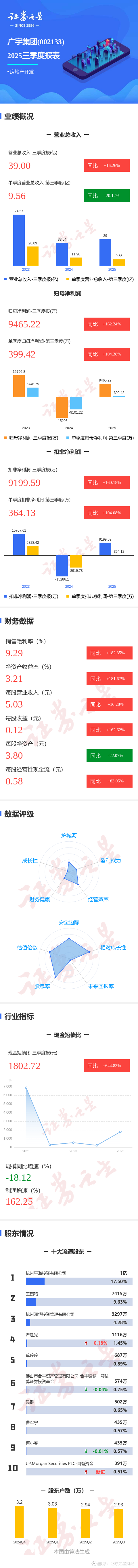 证券之星消息,广宇集团2025年三季报显示,前三季度公司主营收入39.0亿元,同比上升16.26%;归母净利润9465.22万元,同比上升162.25%;扣非净利润9199.59万元,同比上升160.18%;其中2025年第三季度,公司单季度主营收入9.56亿元,同比下降20.13%;单季度归母净利润399.42万元,同比上升104.39%;单季度扣非净利润364.13万元,同比上升104.08%;负债率58.93%,投资收益3680.68万元,财务费用6369.15万元,毛利率9.29%。