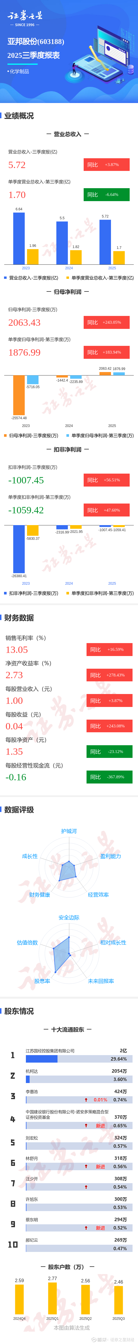 证券之星消息,亚邦股份2025年三季报显示,前三季度公司主营收入5.72亿元,同比上升3.87%;归母净利润2063.43万元,同比上升243.05%;扣非净利润-1007.45万元,同比上升56.52%;其中2025年第三季度,公司单季度主营收入1.7亿元,同比下降6.65%;单季度归母净利润1876.99万元,同比上升183.95%;单季度扣非净利润-1059.42万元,同比上升47.6%;负债率55.48%,投资收益3082.85万元,财务费用936.83万元,毛利率13.05%。
