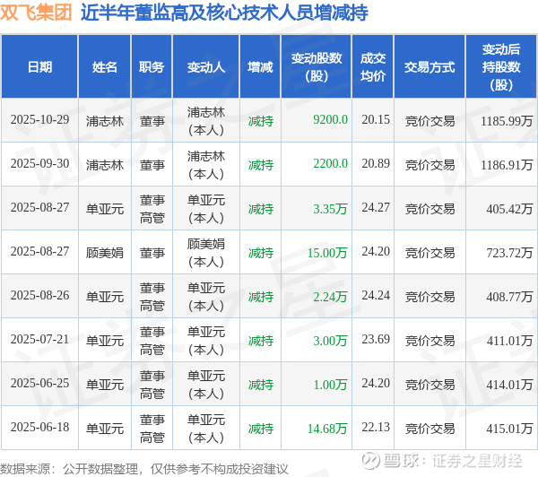 双飞集团近半年内的董监高及核心技术人员增减持详情如下: