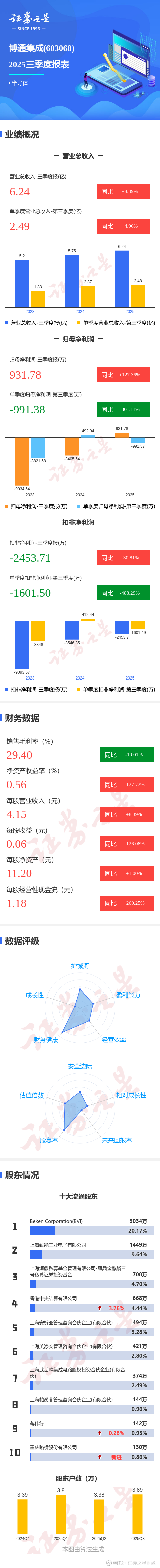 证券之星消息,博通集成2025年三季报显示,前三季度公司主营收入6.24亿元,同比上升8.4%;归母净利润931.78万元,同比上升127.36%;扣非净利润-2453.71万元,同比上升30.81%;其中2025年第三季度,公司单季度主营收入2.49亿元,同比上升4.96%;单季度归母净利润-991.38万元,同比下降301.11%;单季度扣非净利润-1601.5万元,同比下降488.29%;负债率16.52%,投资收益53.13万元,财务费用-1915.03万元,毛利率29.4%。