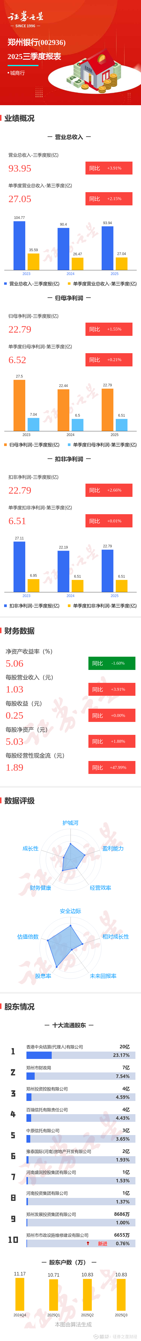 证券之星消息,郑州银行2025年三季报显示,前三季度公司主营收入93.95亿元,同比上升3.91%;归母净利润22.79亿元,同比上升1.56%;扣非净利润22.79亿元,同比上升2.66%;其中2025年第三季度,公司单季度主营收入27.05亿元,同比上升2.15%;单季度归母净利润6.52亿元,同比上升0.22%;单季度扣非净利润6.51亿元,同比上升0.01%;负债率92.25%,投资收益14.63亿元。