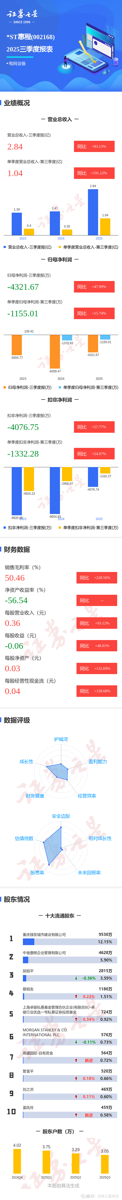证券之星消息,*ST惠程2025年三季报显示,前三季度公司主营收入2.84亿元,同比上升93.13%;归母净利润-4321.67万元,同比上升47.99%;扣非净利润-4076.75万元,同比上升57.78%;其中2025年第三季度,公司单季度主营收入1.04亿元,同比上升191.12%;单季度归母净利润-1155.01万元,同比上升15.75%;单季度扣非净利润-1332.28万元,同比上升54.07%;负债率93.66%,投资收益108.15万元,财务费用1683.42万元,毛利率50.46%。