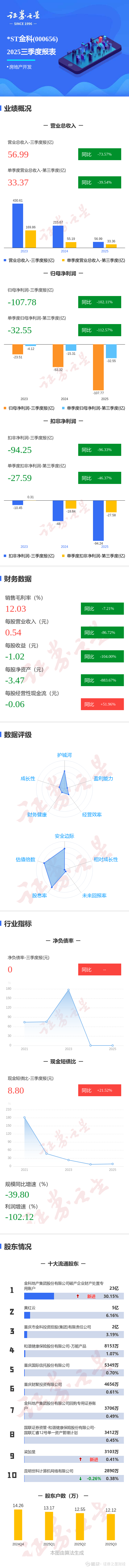证券之星消息,*ST金科2025年三季报显示,前三季度公司主营收入56.99亿元,同比下降73.57%;归母净利润-107.78亿元,同比下降102.12%;扣非净利润-94.25亿元,同比下降96.33%;其中2025年第三季度,公司单季度主营收入33.37亿元,同比下降39.54%;单季度归母净利润-32.55亿元,同比下降112.57%;单季度扣非净利润-27.59亿元,同比下降46.37%;负债率115.27%,投资收益-14.08亿元,财务费用38.91亿元,毛利率12.03%。