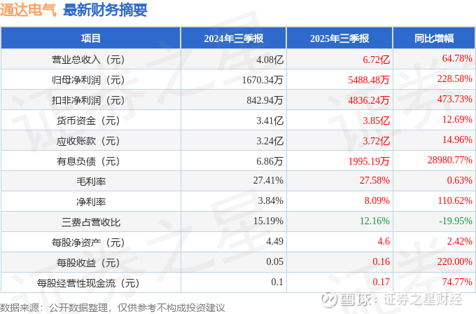 据证券之星公开数据整理,近期通达电气(603390)发布2025年三季报。截至本报告期末,公司营业总收入6.72亿元,同比上升64.78%,归母净利润5488.48万元,同比上升228.58%。按单季度数据看,第三季度营业总收入2.51亿元,同比上升58.54%,第三季度归母净利润2315.16万元,同比上升840.91%。本报告期通达电气公司应收账款体量较大,当期应收账款占最新年报归母净利润比达1452.58%。