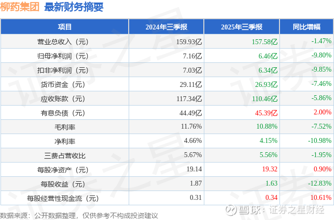 据证券之星公开数据整理,近期柳药集团(603368)发布2025年三季报。根据财报显示,柳药集团净利润同比下降9.8%。截至本报告期末,公司营业总收入157.58亿元,同比下降1.47%,归母净利润6.46亿元,同比下降9.8%。按单季度数据看,第三季度营业总收入54.57亿元,同比上升1.99%,第三季度归母净利润2.16亿元,同比下降14.02%。