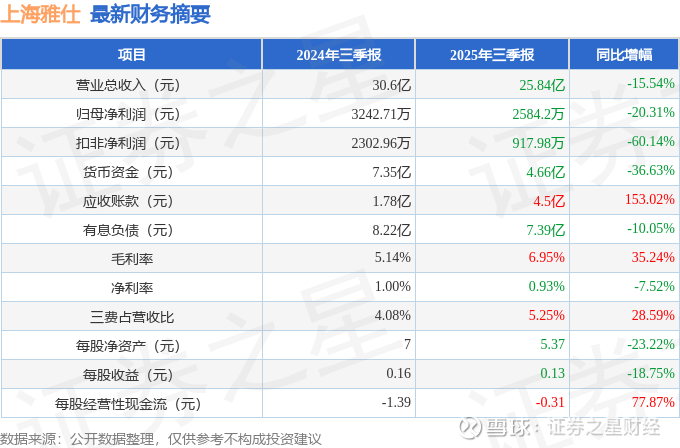据证券之星公开数据整理,近期上海雅仕(603329)发布2025年三季报。截至本报告期末,公司营业总收入25.84亿元,同比下降15.54%,归母净利润2584.2万元,同比下降20.31%。按单季度数据看,第三季度营业总收入5.4亿元,同比下降69.23%,第三季度归母净利润551.56万元,同比下降69.64%。本报告期上海雅仕应收账款上升,应收账款同比增幅达153.02%。