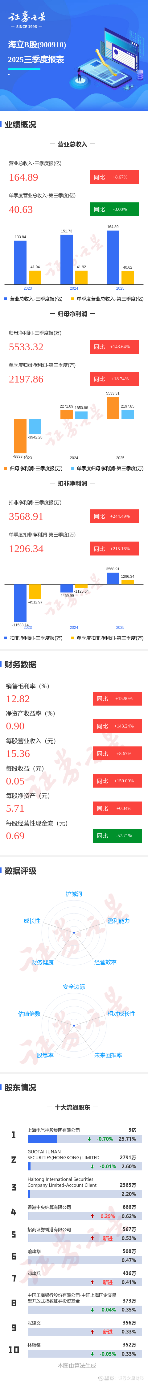 证券之星消息,海立B股2025年三季报显示,前三季度公司主营收入164.89亿元,同比上升8.67%;归母净利润5533.32万元,同比上升143.64%;扣非净利润3568.91万元,同比上升244.49%;其中2025年第三季度,公司单季度主营收入40.63亿元,同比下降3.08%;单季度归母净利润2197.86万元,同比上升18.75%;单季度扣非净利润1296.34万元,同比上升215.16%;负债率66.72%,投资收益-2323.14万元,财务费用2965.79万元,毛利率12.82%。