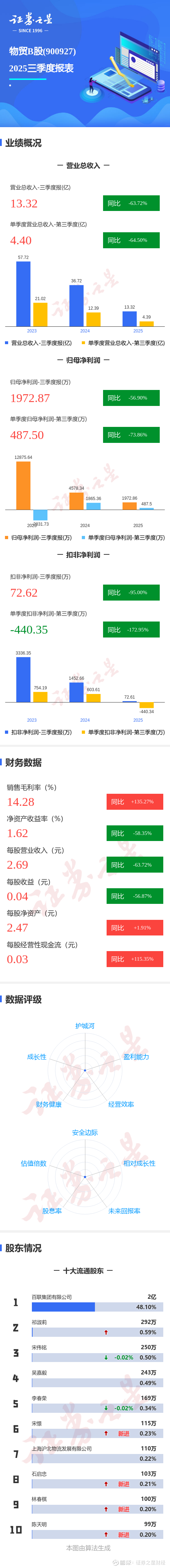 证券之星消息,物贸B股2025年三季报显示,前三季度公司主营收入13.32亿元,同比下降63.73%;归母净利润1972.87万元,同比下降56.91%;扣非净利润72.62万元,同比下降95.0%;其中2025年第三季度,公司单季度主营收入4.4亿元,同比下降64.51%;单季度归母净利润487.5万元,同比下降73.87%;单季度扣非净利润-440.35万元,同比下降172.95%;负债率30.76%,投资收益453.1万元,财务费用-924.64万元,毛利率14.28%。