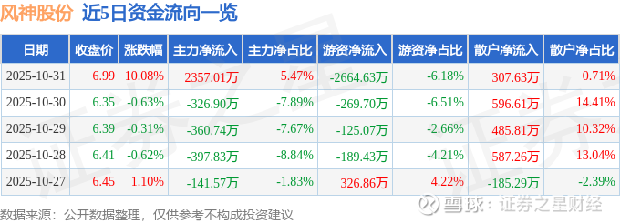 证券之星消息,风神股份10月31日涨停收盘,收盘价6.99元。该股于9点35分涨停,3次打开涨停,截止收盘封单资金为230.53万元,占其流通市值0.05%。