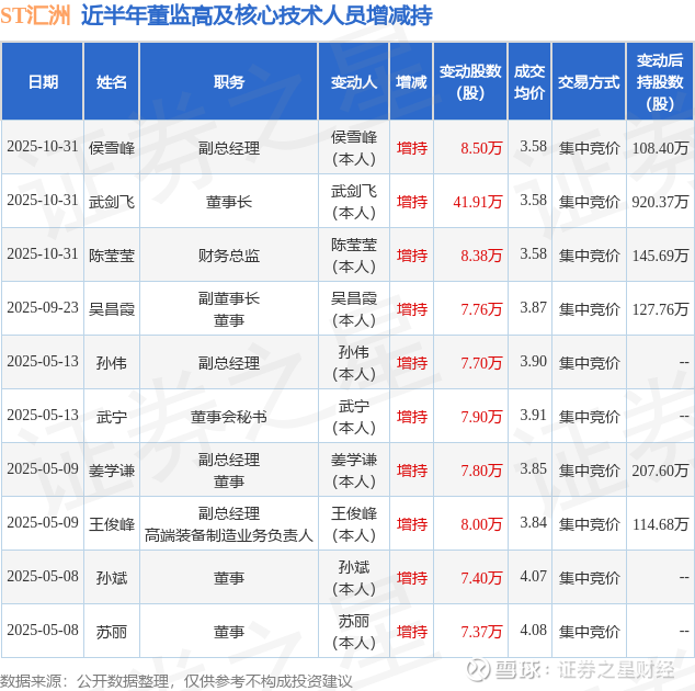 ST汇洲近半年内的董监高及核心技术人员增减持详情如下: