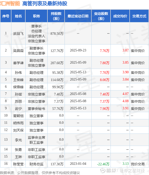ST汇洲的高管列表及最新持股情况如下: