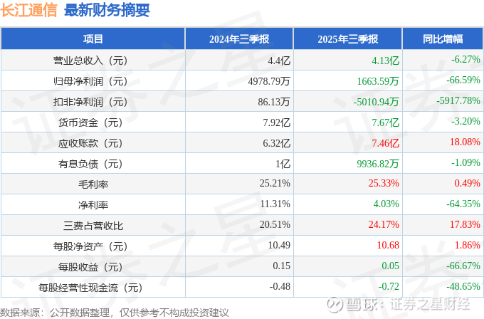 据证券之星公开数据整理,近期长江通信(600345)发布2025年三季报。截至本报告期末,公司营业总收入4.13亿元,同比下降6.27%,归母净利润1663.59万元,同比下降66.59%。按单季度数据看,第三季度营业总收入1.23亿元,同比下降26.45%,第三季度归母净利润2174.76万元,同比下降13.28%。本报告期长江通信公司应收账款体量较大,当期应收账款占最新年报归母净利润比达437.09%。