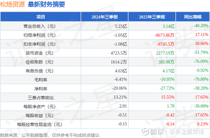 据证券之星公开数据整理,近期松炀资源(603863)发布2025年三季报。根据财报显示,松炀资源亏损收窄。截至本报告期末,公司营业总收入3.14亿元,同比下降40.2%,归母净利润-8673.86万元,同比上升17.11%。按单季度数据看,第三季度营业总收入9136.41万元,同比下降46.42%,第三季度归母净利润-4104.34万元,同比上升8.03%。