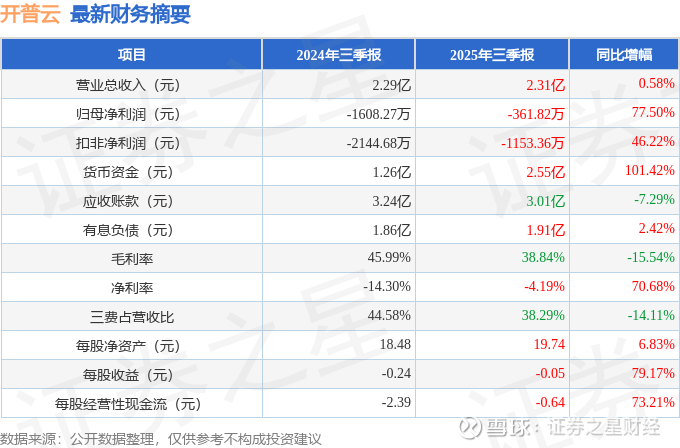 据证券之星公开数据整理,近期开普云(688228)发布2025年三季报。截至本报告期末,公司营业总收入2.31亿元,同比上升0.58%,归母净利润-361.82万元,同比上升77.5%。按单季度数据看,第三季度营业总收入7093.89万元,同比下降4.46%,第三季度归母净利润-739.55万元,同比下降2547.43%。本报告期开普云公司应收账款体量较大,当期应收账款占最新年报归母净利润比达1460.72%。