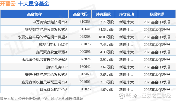 持有开普云最多的基金为申万菱信新经济混合A,目前规模为12.41亿元,最新净值1.2273(10月31日),较上一交易日下跌2.49%,近一年上涨32.96%。该基金现任基金经理为付娟。