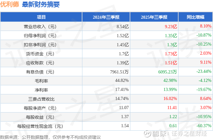 据证券之星公开数据整理,近期优利德(688628)发布2025年三季报。截至本报告期末,公司营业总收入9.23亿元,同比上升8.1%,归母净利润1.35亿元,同比下降10.87%。按单季度数据看,第三季度营业总收入3.05亿元,同比上升5.33%,第三季度归母净利润3709.79万元,同比下降23.15%。本报告期优利德公司应收账款体量较大,当期应收账款占最新年报归母净利润比达82.4%。