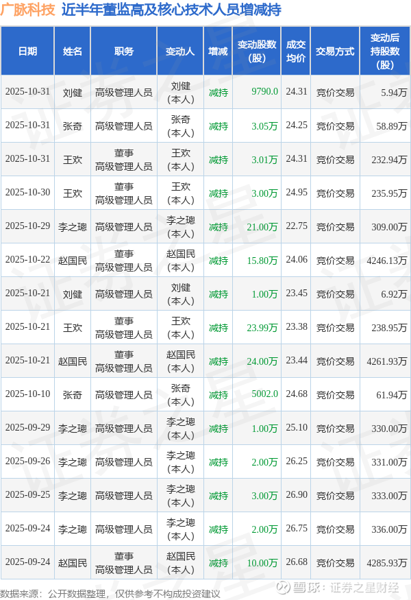 广脉科技近半年内的董监高及核心技术人员增减持详情如下: