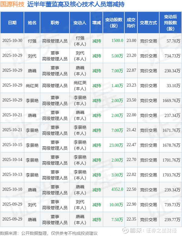 国源科技近半年内的董监高及核心技术人员增减持详情如下: