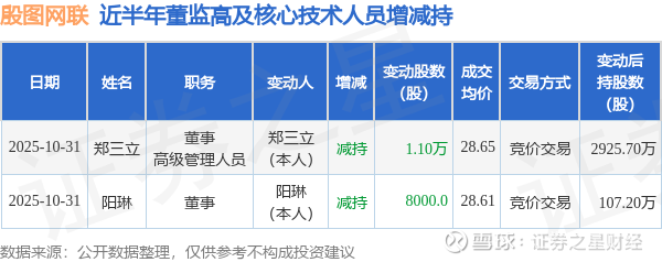 证券之星消息,根据11月1日市场公开信息、上市公司公告及交易所披露数据整理,殷图网联(920508)最新董监高及相关人员股份变动情况:2025年10月31日公司董事,高级管理人员郑三立、董事阳琳共减持公司股份1.9万股,占公司总股本为0.0316%。变动期间公司股价上涨1.74%,10月31日当日收盘报28.03元。