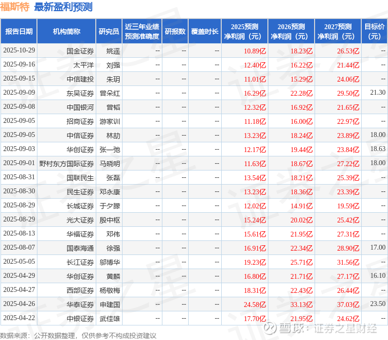 最新盈利预测明细如下: