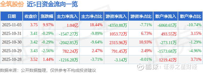 证券之星消息,全筑股份11月3日涨停收盘,收盘价3.75元。该股于11点4分涨停,未打开涨停,截止收盘封单资金为1.1亿元,占其流通市值2.23%。