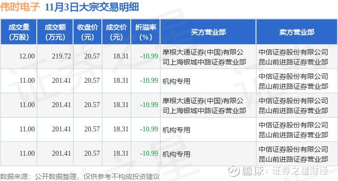 证券之星消息,11月3日伟时电子发生大宗交易,交易数据如下: