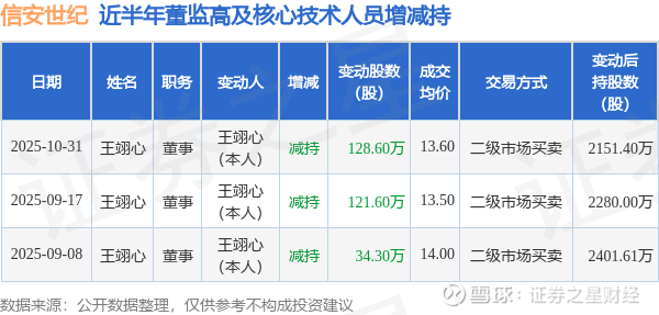证券之星消息,根据11月3日市场公开信息、上市公司公告及交易所披露数据整理,信安世纪(688201)最新董监高及相关人员股份变动情况:2025年10月31日公司董事王翊心共减持公司股份128.6万股,占公司总股本为0.4055%。变动期间公司股价下跌1.77%,10月31日当日收盘报16.63元。