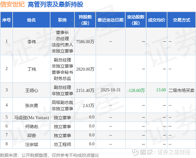 信安世纪的高管列表及最新持股情况如下: