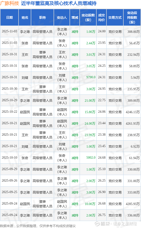 广脉科技近半年内的董监高及核心技术人员增减持详情如下: