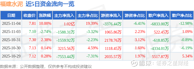 证券之星消息,福建水泥11月4日涨停收盘,收盘价7.81元。该股于10点4分涨停,未打开涨停,截止收盘封单资金为1.01亿元,占其流通市值2.81%。
