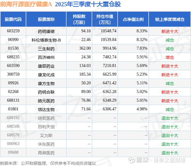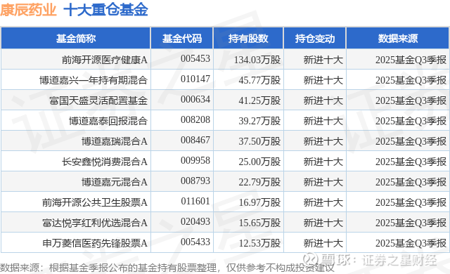 根据2025基金Q3季报公募基金重仓股数据,重仓该股的公募基金共17家,其中持有数量最多的公募基金为前海开源基金的前海开源医疗健康A。前海开源医疗健康A目前规模为5.46亿元,最新净值1.2657(11月3日),较上一交易日下跌0.93%,近一年上涨42.05%。该公募基金现任基金经理为范洁。范洁在任的基金产品包括:前海开源中药股票A,管理时间为2019年5月15日至今,期间收益率为68.72%;前海开源公共卫生股票A,管理时间为2021年3月25日至今,期间收益率为-52.92%。