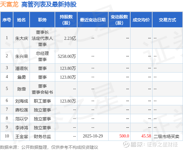 天富龙的高管列表及最新持股情况如下: