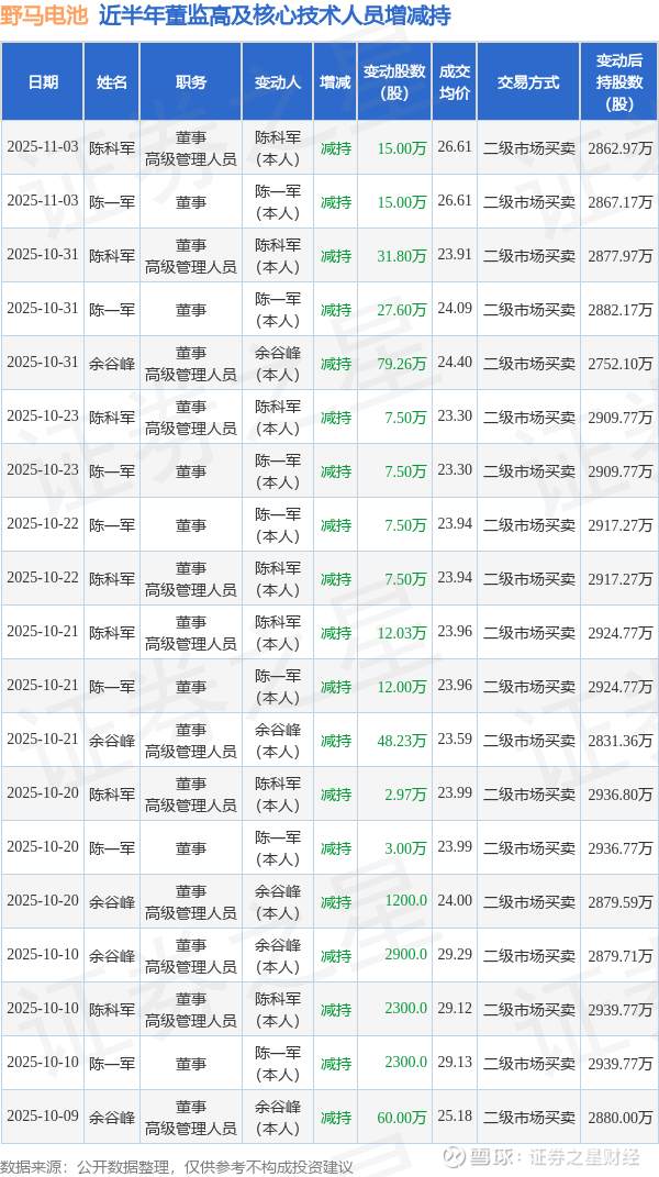 野马电池近半年内的董监高及核心技术人员增减持详情如下: