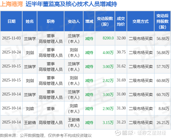 上海港湾近半年内的董监高及核心技术人员增减持详情如下: