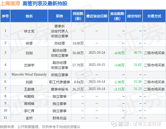 上海港湾的高管列表及最新持股情况如下: