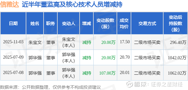 信雅达近半年内的董监高及核心技术人员增减持详情如下: