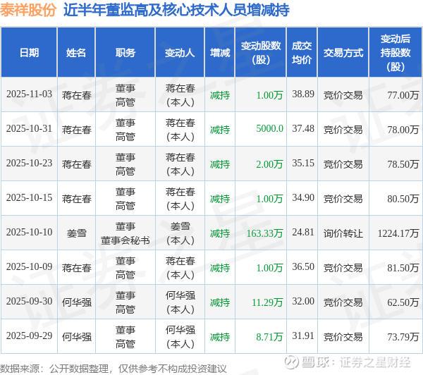 泰祥股份近半年内的董监高及核心技术人员增减持详情如下: