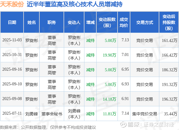 天禾股份近半年内的董监高及核心技术人员增减持详情如下: