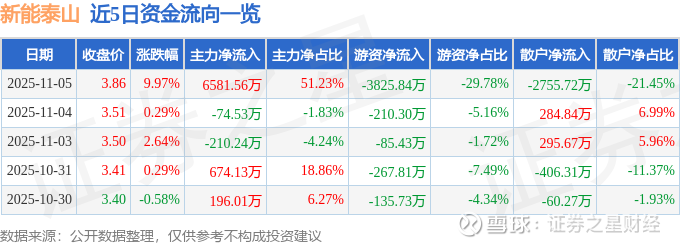 证券之星消息,新能泰山11月5日涨停收盘,收盘价3.86元。该股于9点36分涨停,未打开涨停,截止收盘封单资金为6322.23万元,占其流通市值1.3%。