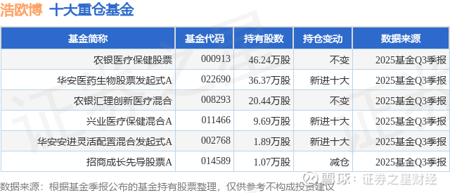 根据2025基金Q3季报公募基金重仓股数据,重仓该股的公募基金共6家,其中持有数量最多的公募基金为农银汇理基金的农银医疗保健股票。农银医疗保健股票目前规模为14.87亿元,最新净值1.7118(11月4日),较上一交易日下跌3.02%,近一年上涨16.94%。该公募基金现任基金经理为梦圆。梦圆在任的基金产品包括:农银汇理创新医疗混合,管理时间为2021年2月24日至今,期间收益率为-44.05%。
