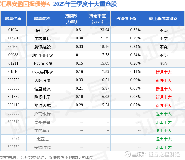 根据2025基金Q3季报公募基金重仓股数据,重仓该股的公募基金共1家,其中持有数量最多的公募基金为汇泉基金的汇泉安盈回报债券A。汇泉安盈回报债券A目前规模为0.63亿元,最新净值1.0606(11月4日),较上一交易日下跌0.07%,近一年上涨3.54%。该公募基金现任基金经理为杨宇 汪雨晨。杨宇在任的基金产品包括:汇泉匠心智选一年持有混合A,管理时间为2022年9月13日至今,期间收益率为15.73%;汇泉中证同业存单AAA指数7天持有,管理时间为2024年1月23日至今,期间收益率为1.8%;汇泉安阳纯债A,管理时间为2024年3月20日至今,期间收益率为39.51%。汪雨晨在任的基金产品包括:汇泉安阳纯债A,管理时间为2024年11月22日至今,期间收益率为1.25%;汇泉中证同业存单AAA指数7天持有,管理时间为2025年2月19日至今,期间收益率为1.04%;汇泉安瑞回报债券A,管理时间为2025年6月25日至今,期间收益率为1.29%;