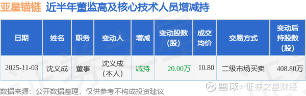 证券之星消息,根据11月5日市场公开信息、上市公司公告及交易所披露数据整理,亚星锚链(601890)最新董监高及相关人员股份变动情况:2025年11月3日公司董事沈义成共减持公司股份20.0万股,占公司总股本为0.0208%。变动期间公司股价上涨4.65%,11月3日当日收盘报10.8元。