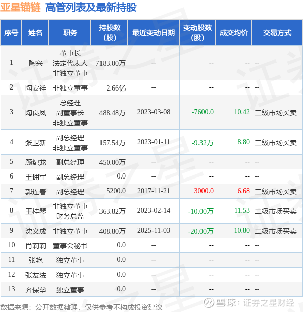 亚星锚链的高管列表及最新持股情况如下: