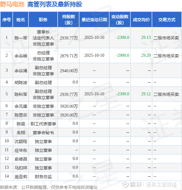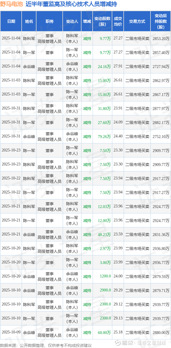 野马电池近半年内的董监高及核心技术人员增减持详情如下:
