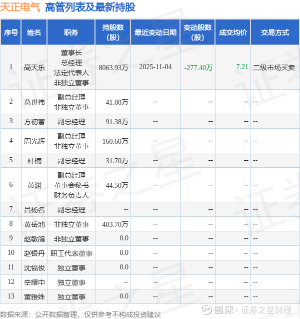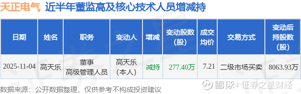 证券之星消息,根据11月5日市场公开信息、上市公司公告及交易所披露数据整理,天正电气(605066)最新董监高及相关人员股份变动情况:2025年11月4日公司董事,高级管理人员高天乐共减持公司股份277.4万股,占公司总股本为0.5496%。变动期间公司股价上涨0.92%,11月4日当日收盘报7.66元。