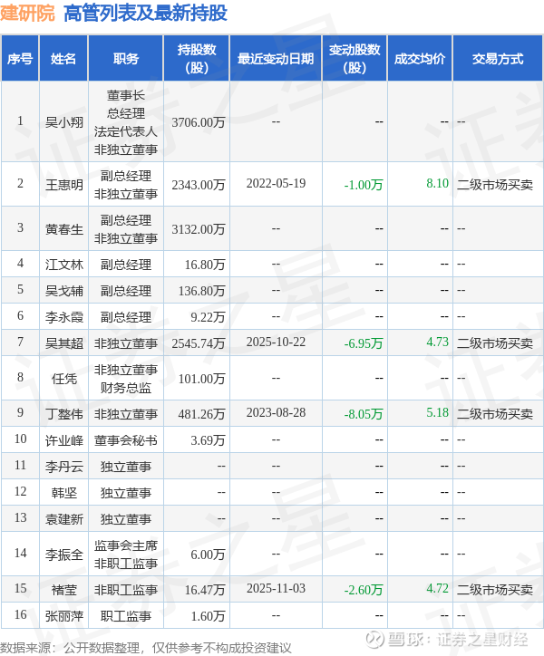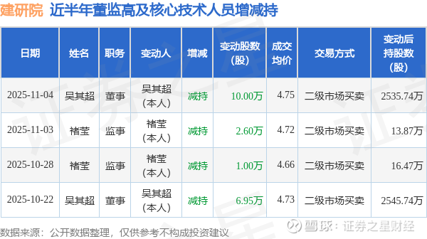 建研院近半年内的董监高及核心技术人员增减持详情如下:
