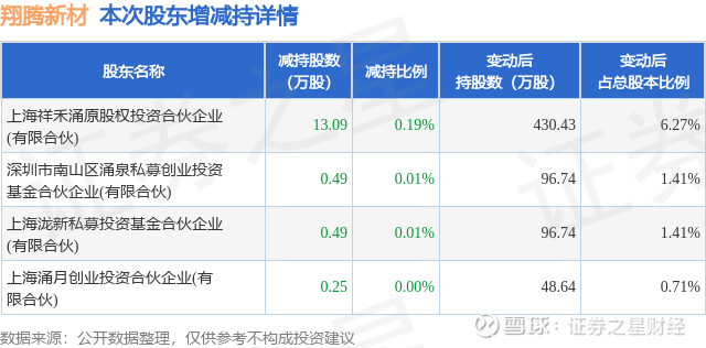 证券之星消息,11月5日翔腾新材发布公告《翔腾新材:关于股东提前终止减持计划暨减持结果公告》,其股东深圳市南山区涌泉私募创业投资基金合伙企业(有限合伙)、上海祥禾涌原股权投资合伙企业(有限合伙)、上海泷新私募投资基金合伙企业(有限合伙)、上海涌月创业投资合伙企业(有限合伙)于2025年10月23日至2025年11月3日间合计减持14.32万股,占公司目前总股本的0.2084%,变动期间该股股价上涨3.57%,截止11月3日收盘报31.65元。